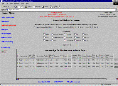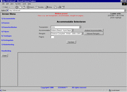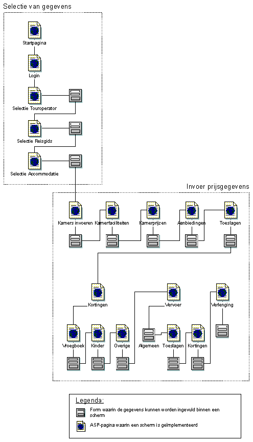 Na het inlogscherm moet er als eerste een touroperator geselecteerd worden, daarna een accommodatie die ingevoerd gaat worden en als laatste moet de reisgids van de betreffende touroperator gekozen worden waarin de geselecteerde accommodatie vermeld staat. Dit lijkt een simpele volgorde, maar er zitten wat haken en ogen aan wanneer dit geprogrammeerd moet worden met behulp van ASP en HTML. Dit komt doordat ASP op de server uitgevoerd moet worden en de keuze van de gebruiker gedaan wordt op een werkstation. Die keuze moet dan eerst doorgestuurd worden naar de server voordat deze in ASP bekend is. Dit betekent dat er een extra aantal handelingen moeten plaatsvinden voordat bijvoorbeeld de reisgidsen van één touroperator getoond kunnen worden.