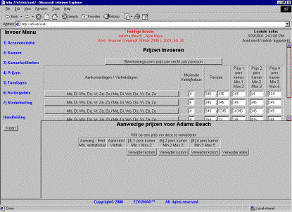 Het is mij, door tijdgebrek, niet gelukt om kortingen, toeslagen, aanbiedingen en het wintervervoer te laten invoeren. Dit is echter niet het moeilijkste deel meer, omdat deze niet zo ingewikkeld zijn als de prijsinvoer van de kamers. Deze onderdelen betreffen slechts één record per korting, toeslag, enz. die dan vervolgens gekoppeld kunnen worden aan een prijs van een kamer in een bepaalde periode.