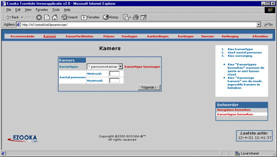 Met de invoerapplicatie, zoals hij nu is, kan een touroperator, een accommodatie en de reisgids geselecteerd worden waar de prijzen voor ingevoerd moeten worden. Vervolgens is het mogelijk om de aanwezige kamerTypes in te voeren met de bijbehorende kamerfaciliteiten. Van deze kamers kunnen daarna de periodes opgegeven worden waarin ze beschikbaar zijn met de bijbehorende prijs.